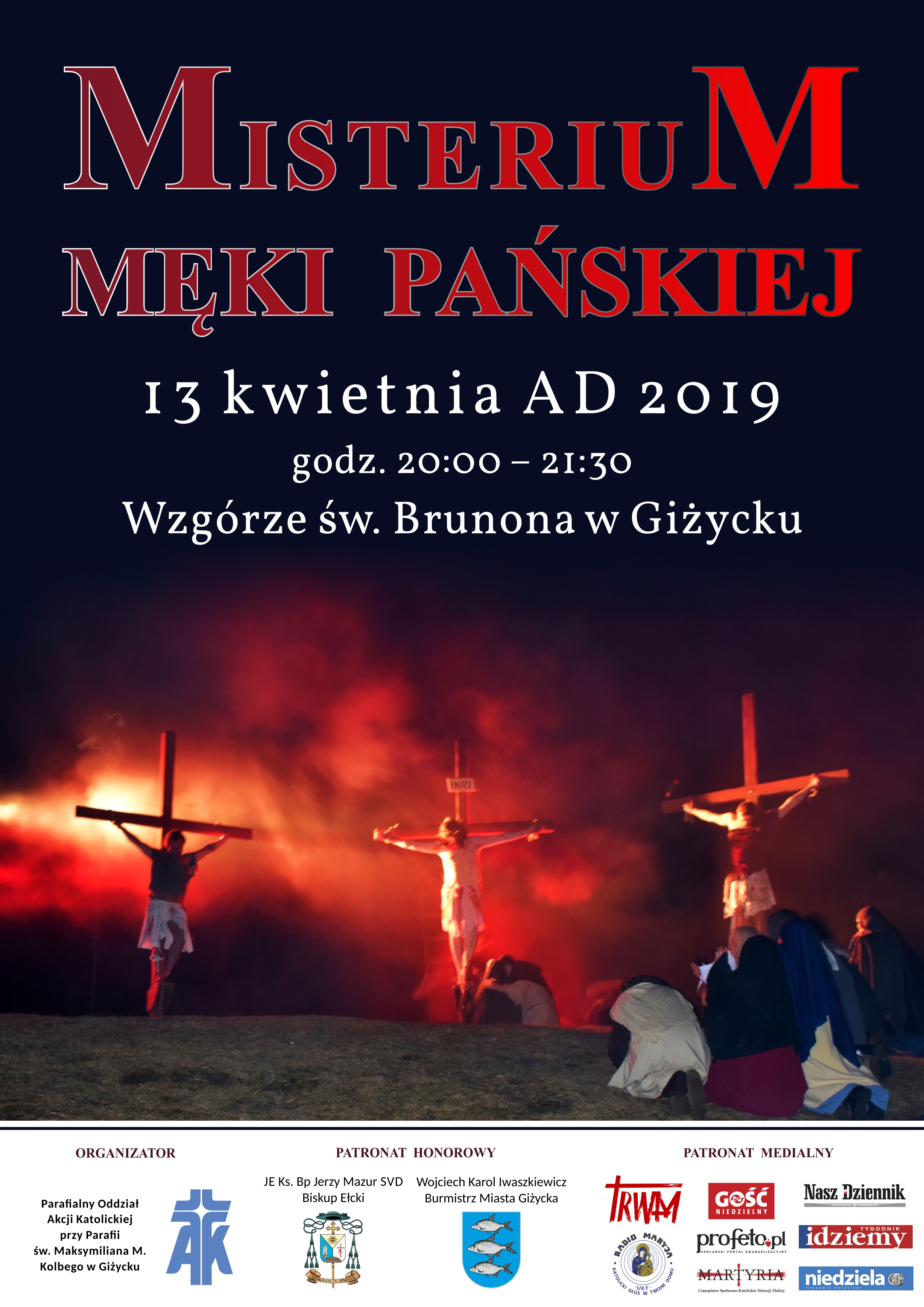 W wigilię Niedzieli Palmowej, 13 kwietnia 2019 roku, na Wzgórzu św. Brunona (nad jeziorem Niegocin) w Giżycku, w miejscu, gdzie wraz z osiemnastoma misjonarzami w 1009 roku zginął śmiercią męczeńską św. Brunon z Kwerfurtu, zostanie wystawione Misterium Męki Pańskiej. Misteria Męki Pańskiej w tym miejscu zapoczątkował trzy lata temu ks. Mariusz Pawlina (obecnie wikariusz par. NMP Matki Kościoła w Gołdapi), dlatego tegoroczne Misterium wpisuje się już w tradycję wielkich wydarzeń wielkopostnych Diecezji Ełckiej: duchowego przygotowania do świąt Zmartwychwstania Pańskiego i wielkiego dziękczynienia Bogu za zbawienie człowieka.