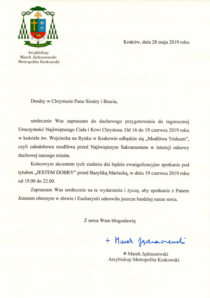 Z upoważnienia Ks. Arcybiskupa Marka Jędraszewskiego zapraszam serdecznie do udziału w całodobowym MODLITEWNYM TRIDUUM przed Najświętszym Sakramentem o duchową odnowę Krakowa, jako przygotowanie do UROCZYSTOŚCI BOŻEGO CIAŁA.